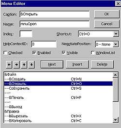 Шаг 2. С помощью редактора Menu Editor (рис. 2) создайте стандартное меню «Файл» (имя компонента mnuFile) с командами «Создать» (mnuNew «горячие» клавиши +N), «Открыть» (mnuOpen +O), «Сохранить» (mnuSave +S), «Печать» (mnuPrint +P) и «Выход» (mnuExit +X), а также меню «Правка» (mnuEdit) с командами «Вырезать» (mnuCut +B), «Копировать» (mnuCopy +C), «Вставить» (mnuPaste +V), «Шрифт» (mnuFont), «Найти» (mnuFind +F) и «Следующее» (mnuNext ). Отдельные команды можно сгруппировать с помощью разделителей.