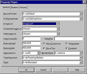 Особенностью структуры такого элемента, как ToolBar, является иерархическая объектная модель, поэтому он более сложен в применении, чем элементы управления RichTextBox и CommonDialog. ToolBar содержит коллекцию объектов Button со своими собственными свойствами и методами. Но изображения кнопок хранятся не внутри элемента управления ToolBar, а внутри коллекции ListImages элемента управления ImageList (видимо, чтобы программистам жизнь медом не казалась).