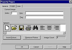 Чтобы добавить кнопку в процессе разработки программы, щелкните на Insert Button во вкладке Buttons диалогового окна Property Pages элемента управления ToolBar. Объекты Button могут содержать либо изображение, либо название, либо то и другое вместе. Наверное, не имеет смысла делать кнопки с названиями, поскольку каждая из них обладает свойством ToolTipText (строка-подсказка). Но обязательно установите свойство Key для каждого объекта Button таким образом, чтобы можно было идентифицировать кнопку, на которой щелкнул пользователь.