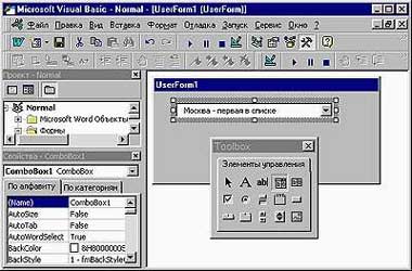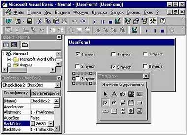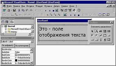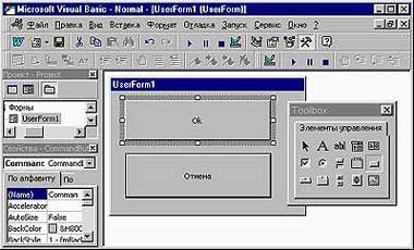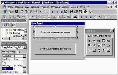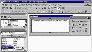 Все свойства, задаваемые в «Окне свойств», можно изменять и из программы. Например, команда TextBox1.Enabled=True позволяет пользователю ввести текст в поле ввода TextBox1, а команда CheckBox1.Value=False снимет флажок с именем CheckBox1. Такая возможность делает формы VBA динамическими, т. е. их содержимое может в ответ на действия пользователя изменяться немедленно, причем без выгрузки и повторной загрузки формы. Сама форма может работать как обычное диалоговое окно программы для Windows — например, выбор пользователем значения из списка позволяет каждый раз выводить в форму какой-либо текст, неодинаковый для разных значений. Наиболее часто динамические формы применяются для отключения элементов, которые не могут быть использованными при каких-либо условиях. Например, в форме, состоящей из поля ввода текста и кнопки, вызывающей процедуру вычисления квадратного корня, кнопка может становиться неактивной при написании в поле ввода отрицательного числа.