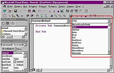 Чтобы получить список возможных событий для элемента, следует поставить курсор внутрь процедуры обработки стандартного события и выбрать нужное, которое размещается справа вверху окна написания программы. Слева вверху этого же окна указаны все процедуры и функции программы реакции формы на события. В последней могут быть представлены и другие процедуры и функции, не связанные с элементами формы (рис. 15).