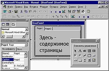 - Набор вкладок и 10-й элемент — наборы страниц, которые представляют комплект страниц-вкладок, схожих с закладками «Общие», «Сохранение», «Печать» и другими в диалоговом окне Word «Сервис?Параметры». Отличие между этими двумя элементами (т. е. набором вкладок и 10-м элементом) состоит в том, что 9-й при переключении на другую страницу не затрагивает остальные элементы формы, даже когда они находятся на нем, а изменить состояние других элементов можно только программно. Десятый же элемент при своем переключении принудительно (т. е. вне зависимости от программы) скрывает элементы на одной своей странице и показывает на другой. Чтобы лучше понять разницу между этими двумя типами элементов, создайте форму с каждым из них и посмотрите, как они работают, — при переключении закладок в 9-м элементе на них самих ничего меняться не будет, а при использовании 10-го элемента на каждой новой закладке вы можете разместить свой, отдельный набор элементов.