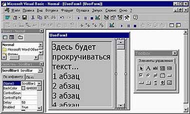 К сожалению, в настоящее время нет единой номенклатуры этих двух элементов форм VBA, поэтому в справочной системе и литературе можно встретить разные названия для каждого из них (рис. 9). - Полоса прокрутки — аналогична той, что есть в Word. Может передавать в программу число, равное расстоянию в пунктах от ее начала. Верхний предел расстояния неограничен (рис. 10).