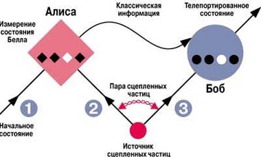 Схема телепортации такова. Предположим, что у Алисы есть частица в определенном квантовом состоянии (частица 1) и она хочет, чтобы у живущего от нее вдали Боба была такая же частица. Алиса не может произвести такие измерения, которые позволили бы Бобу реконструировать квантовую систему. Для того чтобы осуществить задуманное, Алисе и Бобу необходимо обзавестись парой сцепленных частиц (частицы 2 и 3). Алиса производит сцепление исходной частицы 1 и находящейся в ее распоряжении частицы 2. При этом частица 2 вначале переходит в состояние, «противоположное» состоянию частицы 1, а затем обе частицы оказываются в одном из четырех возможных сцепленных состояний (состояний Белла). Алиса определяет, какое состояние было реализовано, путем измерения, результаты которого она посылает Бобу. При сцеплении частица 3, находящаяся у Боба, сначала переходит в исходное состояние частицы 1 (ведь она сцеплена с частицей 2!), а затем — в то состояние, в котором частица 1 оказалась после сцепления. Боб, получив от Алисы результаты ее измерения и выяснив, в каком состоянии Белла находится его частица, может путем обратного преобразования перевести частицу 3 в состояние, в котором находилась частица 1 до телепортации. Важно, что во время телепортации Алиса разрушает состояние первой частицы, а Боб это состояние получает, при этом ни Алиса, ни Боб не получают никакой информации о состоянии частицы 1.