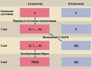 Чтобы проиллюстрировать отличия квантовых алгоритмов от классических, остановимся на алгоритме Шора более подробно. Предположим, что N — число, которое нужно разложить на простые множители. Выберем целое число с, меньшее N, и вычислим значение функции:
