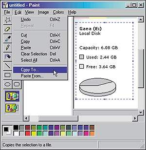 Только активное окно. Чтобы сохранить изображение одного лишь активного окна, проделайте все описанные выше шаги, но на этот раз для копирования в Буфер обмена лишь части экрана укажите сочетание клавиш +. В этом случае изображение, которое будет вставлено в имеющуюся рабочую область редактора Paint, окажется, вероятно, меньше этой области. Если это так, то не нужно щелкать ни на каких значках инструментов после вставки изображения. Вместо этого сразу же после вставки изображения выберите для его сохранения в файле опции «Правка?Копировать в файл». Укажите папку и имя файла, а затем щелкните на кнопке «Сохранить». Таким образом вы избавитесь от необходимости сохранять ненужные фоновые элементы изображения. Если требуется подретушировать только что сохраненное изображение, задайте пункты «Файл? Открыть», отметьте созданный файл и щелкните на кнопке «Открыть». Когда программа осведомится, сохранять ли рабочее поле вместе с только что вставленным изображением, выберите опцию «Нет». Отредактируйте файл и снова сохраните его. Аналогичную технику можно использовать тогда, когда нужно подрезать изображение. Чтобы ограничить нужную вам область, воспользуйтесь прямоугольной рамкой, а чтобы сохранить полученное изображение в отдельном файле, — командами «Правка?Копировать в файл».