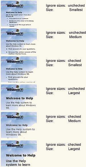 Чтобы более точно настроить размер шрифта в пределах этих диапазонов, в IE 4 или Windows 98 щелкните в окне «Свойства: Интернет» на кнопке «Шрифты». В следующем раскрывшемся диалоговом окне выберите в списке доступных размеров нужный вам шрифт. Если установлены IE 5, Windows 98 SE или Windows 2000, то запустите Internet Explorer, укажите «Вид? Размер шрифта» и отметьте нужный размер. Чтобы увидеть изменения, возможно, придется закрыть и вновь открыть окно Справки.