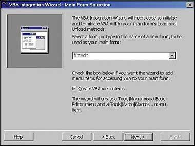Шаг 2. В окне Main Form Selection необходимо задать основную форму пользовательского интерфейса (рис. 4), в данном примере это frmEdit. Мастер создает процедуру, которая будет запускать механизм VBA как часть инициализации основной формы, а также команду Tools|Macro для запуска интегрированной среды разработки VBA из бизнес-приложения и доступа к диалоговому окну Macros.