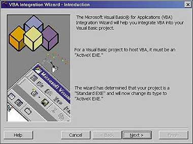 Шаг 1. Мастер выводит на экран диалоговое окно Introduction (рис. 3) и сразу же проверяет тип проекта на совместимость с VBA. Чтобы интегрироваться с механизмом VBA на базе COM, приложение с внедренным VBA должно иметь тип ActiveX EXE. Если тип проекта требует изменения, мастер сообщит о том, что автоматически поменяет эту установку.