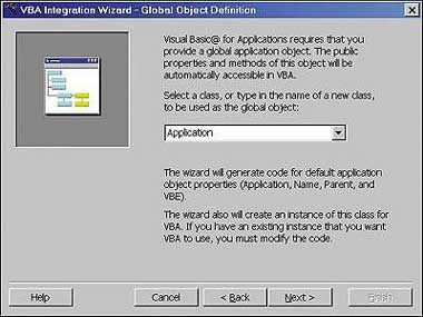 Если в процессе работы мастера VBA Integration Wizard оставить предлагаемое имя глобального объекта приложения — CApplication — без изменения, то, запустив приложение с интегрированным в него VBA непосредственно в среде VB и перейдя затем в VBA, вы обнаружите, что этот объект недоступен. Для нормальной работы с объектом нужно создать загрузочный EXE-модуль.