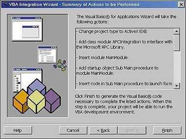 Интеграция VBA базируется на применении библиотеки APC. Мастер же, по сути дела, формирует начальный текст программы для подключения и инициализации основных функций APC в двух созданных им новых модулях классов APCIntegration и Application, присоединенных к исходному проекту. Кроме того, мастер вносит ряд дополнений в существовавшее описание форм. Все программные фрагменты, созданные им, обозначаются логическими скобками в виде комментариев:
