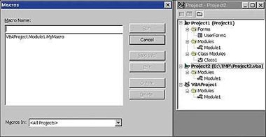 Второй тип VBA-проекта создается VBE-командой File|New Project (будем называть его просто Project в отличие от VBAProject). Такой проект можно сохранять и открывать заново, применяя несколько вариантов одновременно. В нем можно записывать программные модули и формы и т. д. Однако в качестве макрокоманд нашего основного приложения могут использоваться только процедуры VBAProject, подпрограммы Project являются недоступными (рис. 9а).