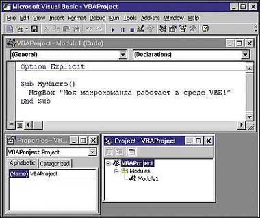 Она доступна через команду Tools|Macros как из VBE, так и из TxtEdit. Но создавать новые макрокоманды из среды TxtEdit можно только при существующем программном модуле в VBAProject. Теперь среда VBE приняла более знакомый вид (рис. 9), поэтому дальнейшие действия таковы: создаем процедуры программного модуля, формы, размещаем на них элементы управления и т. д.