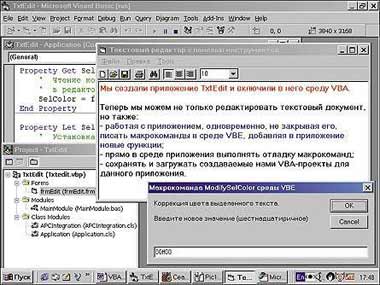 Обновленное приложение TxtEdit теперь может загружать файлы нескольких видов: текстовые документы, а также VBA-проекты типов VBAProject и Project. Связь между средой редактора и VBE может осуществляться путем обращения к макрокомандам VBAProject. Пока мы написали только одну макрокоманду, которая не имеет никакого функционального отношения к TxtEdit, она лишь просто может заявить о том, что действительно получает управление и готова выполнять наши программы. Добавим в нее что-нибудь полезное.