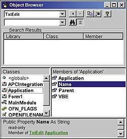 Связь макроса в среде VBE с самими офисными программами и их документами в MS Office выполняется через систему объектов. Какие же объекты TxtEdit доступны нам? Для ответа на этот вопрос откроем окно Object Browser (F2) и в списке Project/Library выделим только TxtEdit (рис. 10). Здесь видно, что проект содержит объект Application, имеющий компоненты Application, Parent, Name и VBE. Модернизируем макрокоманду MyMacro так, чтобы прочитать параметр Name, являющийся свойством символьного типа: