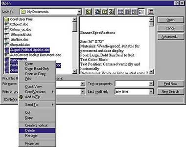 Проводник Windows — не лучшее средство для стирания файлов. Редакторы Word 97 и 2000, позволяющие предварительно просмотреть документы, более подходят для этой процедуры. Выберите пункты «Файл?Открыть» (File?Open) и в появившемся диалоговом окне «Открытие документа» (Open) перейдите в ту папку, где находится документ, который вы намерены удалить. Если в диалоговом окне «Открытие документа» (Open) не активизирован предварительный просмотр, то в Word 97 щелкните на значке «Просмотр» (Preview), а в Word 2000 — на стрелке рядом со значком «Представления» (Views), после чего отметьте «Просмотр» (Preview).