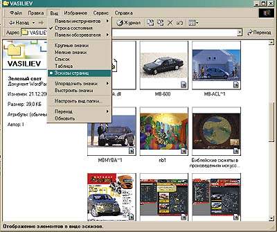 К четырем стандартным представлениям папки, имевшимся в Windows 95/98 (крупные значки, мелкие значки, список, таблица), в Windows Me и 2000 добавилось еще одно — «эскизы страниц», в котором для графических файлов выводятся в уменьшенном виде содержащиеся в них рисунки, а для прочих — большая пиктограмма их типа (например, буква W для документов Word), заключенная в рамку.