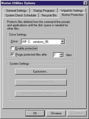 Norton Protection — утилита, доступная лишь из пункта Options программы Norton Utilities Integrator. Она блокирует запись новых файлов на место удаленных до тех пор, пока не будет исчерпано пустое пространство на диске. Так, если на жестком диске оставались свободными 20 Мбайт и были удалены файлы объемом 40 Мбайт, то новые данные сначала будут располагаться именно на тех незанятых 20 Мбайт, а уже затем на освободившихся 40. Это дает лишний шанс восстановить удаленные файлы — некоторое время информация о них не будет «затираться» новыми записями. При использовании Norton Protection особенно эффективно удастся с помощью программы Norton UnErase Wizard восстановить практически все удаленные файлы.