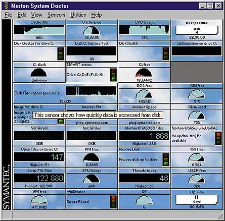 Утилиту Norton System Doctor следовало бы назвать, наверное, System Monitor, ведь ее окно представляет собой набор «сенсоров» — т. е. красивых значков, динамично изменяющихся и отражающих различные параметры функционирования компьютера. Тут и Smart-система жестких дисков, и операции с процессором, и отображение скорости соединения с Internet, и число открытых файлов. Можно посмотреть историю изменения каждого из параметров, в определенной степени преобразовать настройкой внешний вид значка и указать частоту обновления информации. Но, увы, работа сенсоров отбирает много системных ресурсов. Загрузка процессора иногда бывает полной даже без запуска других программ, а обращение к жесткому диску происходит постоянно. Впрочем, если вывести лишь несколько сенсоров, то программа System Doctor ускорится, однако ее информативность снизится. Из окна System Doctor можно вызвать любую другую утилиту Norton Utilities.