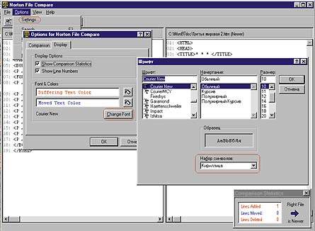 Весьма полезной является и программа Norton File Compare, позволяющая найти различия между двумя загруженными в нее файлами. А чтобы в ней можно было сравнивать и файлы, содержащие кириллицу, следует выбрать Options?Settings?Display?Change- Font и в поле «Набор символов» указать «Кириллица».