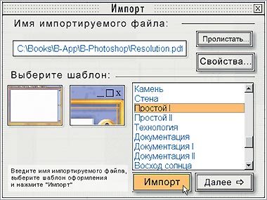 Шаблон берется из предоставляемых по списку. Для каждого шаблона в окнах слева отображаются общий вид интерфейса будущей электронной книги, а в правом верхнем углу обычные для операционной системы Windows кнопки. Этого вполне достаточно для выбора. Щелчком на кнопке «Импорт» пользователь завершает свою работу — все дальнейшее выполняется программой, причем сохраняются на диске все файлы публикации.