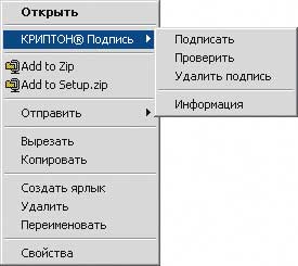 | Пример встраивания интерфейса программы электронной подписи в контекстное меню Windows Explorer |