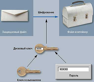 - хранения всей зашифрованной информации создается специальный файл-контейнер. Системой защиты генерируется ключ, который пользователь должен хранить при себе.