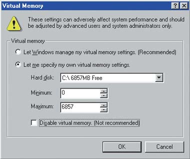 По умолчанию система Windows автоматически подстраивает размер файла подкачки таким образом, чтобы он удовлетворял ее потребностям. Почти заполненный жесткий диск сжимает этот файл, что может привести к снижению быстродействия, а иногда и к аварийному отказу системы. Поэтому всегда выделяйте под файл подкачки не менее 100 Мбайт дискового пространства. Чтобы установить размер файла подкачки вручную, выберите в диалоговом окне управления виртуальной памятью позицию «Параметры виртуальной памяти устанавливаются вручную».