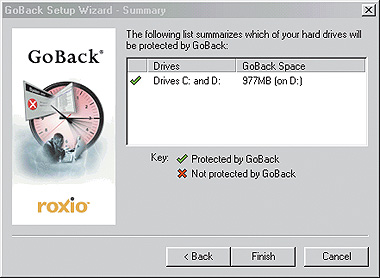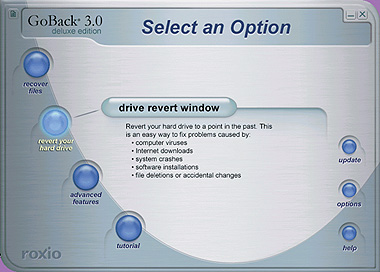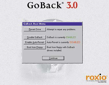 Утилита GoBack компании Roxio (http://roxio.com), интегрирующаяся в операционную систему, служит для предотвращения потери данных при ошибках пользователя, ошибках в используемом программном обеспечении, вследствие вирусных атак, неудачных установок программного обеспечения и краха системы. Она резервирует для своей работы около 10% (по умолчанию) всего дискового пространства и сохраняет там протокол дисковых операций и необходимые данные для восстановления файлов. Эта утилита не заменяет собой утилит резервного копирования (backup), но дополняет их, позволяя восстановить файл, созданный и удаленный позже последней процедуры резервного копирования, или восстановить систему после какого-либо программного сбоя, будь то деструктивные действия вируса или содержащая ошибки процедура инсталляции.