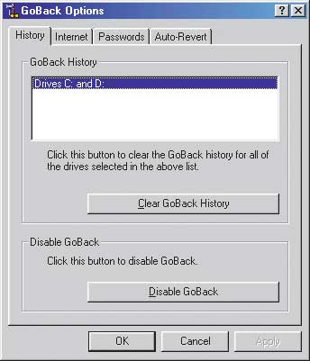 Есть и еще один неприятный момент. После того как на диске был создан, а затем уничтожен один файл объемом 512 Мбайт, данные обо всех ранее уничтоженных файлах оказались забыты. Более того, GoBack отключила протоколирование изменений, и все позднейшие действия с диском запротоколированы не были, а следовательно, исчезла и возможность «отката». Притом для всех логических дисков сразу. Правда, примерно через час GoBack возобновила ведение протокола. Уменьшить время ее «неактивности» можно, только перезагрузив ОС, так как даже Option?History?Clear GoBack History не помогает. Таким образом, всего несколько полноразмерных видеофайлов могут парализовать работу GoBack на целый час. По идее (и согласно документации), GoBack должна помнить всю историю дисковых операций на определенную глубину, на практике же после «массивной дисковой активности» протокол начинается «с чистого листа», да еще и с задержкой во времени. Гораздо логичнее было бы предусмотреть динамическое изменение размера файла протокола. Хотелось бы также иметь возможность задавать расширения (скажем, *.avi) или локализацию файлов (например, C:WindowsTemp), которые не заносятся в протокол во избежание его переполнения.