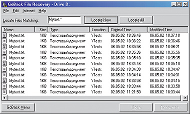 Для проверки способности к восстановлению системы я переместил рабочую папку программы в другое место. При этом удалось скопировать все, кроме трех файлов. При попытке запустить главное меню GoBack система сообщила, что нужного файла на прежнем месте нет, но быстро нашла его на новом месте, после чего легко был произведен «откат». При второй попытке то же самое было сделано после перезагрузки компьютера в режиме MS DOS. Естественно, удалось скопировать все файлы. Однако после перезагрузки, хотя файлы остались там, куда я их переместил, работоспособность GoBack не пострадала.