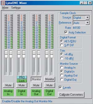 Основной инструмент взаимодействия с платой LynxONE — устанавливаемая вместе с драйвером программа LynxONE Mixer. На панели LynxOne Mixer выделяются четыре индикатора мощности входящего и выходящего аудиосигнала по аналоговому и цифровому каналам. Под каждым индикатором расположены кнопки выключения звука (и регуляции громкости) и мониторинга. В правой части панели находятся инструменты управления режимом синхронизации, индикатор активной частоты дискретизации, средства управления «подрезкой» (trim) сигнала, а также сигналом мониторинга. В меню есть еще больший набор важных и интересных функций.
