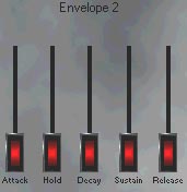 | Рис. 10. Поле Envelope 2 панели Studioware. Ползунки Attack, Hold, Sustain и Release управляют параметрами огибающей амплитуды |
