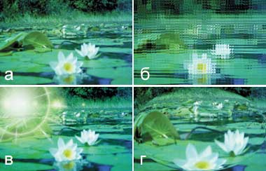 Рис. 4. Примеры действия фильтров The GIMP: а — оригинальное изображение; б — применен фильтр «Эффекты стекол?Стеклянные блоки»; в — применен фильтр «Световые эффекты?Градиентная вспышка»; г — применен фильтр «Эффекты стекол?Линза» |