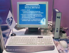 Устройство на базе продукта третьего производителя процессоров — фирмы VIA (www.via.com.tw) — нашлось на стенде все той же российской компании. Тонкие клиенты K-Systems Termin построены на платформе VIA Eden ESP5000, имеют 64-Мбайт ОЗУ и 32-Мбайт флэш-диск. Они работают под управлением Windows CE .NET 4.1 и способны функционировать в сети с сервером на Windows 2000 или 2003 Server.