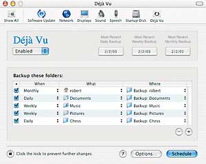 Автоматическая защита. В то время как SilverKeeper и Synk приходится запускать вручную, существует множество программ резервного копирования со встроенными планировщиками заданий, благодаря которым они загружаются автоматически в фоновом режиме. Среди простейших — De/ ja Vu 2.3 (оценка: ****; совместимость с ОС: Mac OS X; цена: 15 долл.; разработчик: Propaganda Products, www.propagandaprod.com), представляющая собой панель предпочтений (см. рисунок). В De/ ja Vu предусмотрена возможность создавать несколько различных заданий архивации, каждое из которых будет выполняться в указанное пользователем время, если компьютер включен и диск для резервных копий доступен. При этом вам не нужно даже входить в систему под своим именем. Примечательно, что De/ ja Vu умеет создавать копии системных дисков, с которых можно загрузить машину, когда в штатном режиме это сделать не удается.