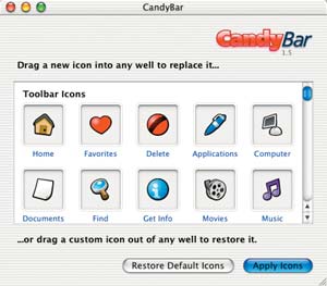 Программа CandyBar модифицирует значки в панели инструментов Finder, пиктограммы папок, Корзины и др. Для этого в окне CandyBar нужно просто перетащить мышью новый значок на старый. В первый раз вам, возможно, понадобится ввести пароль администратора. Чтобы восстановить значок по умолчанию, следует нажать кнопку Restore Default Icon. Как недостаток утилиты стоит отметить необходимость перезагрузить Macintosh, чтобы изменения, сделанные CandyBar, вступили в силу.