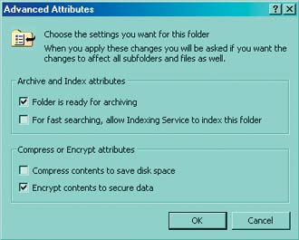 В операционную систему Windows 2000 встроена система шифрования EFS (Encrypting File System), позволяющая хранить некоторые блоки файловой системы NTFS в зашифрованном виде. Эта технология очень удобна, потому что работает как встроенный системный сервис. Для того чтобы зашифровать файл или каталог, нажмите на кнопку Advanced в свойствах файла или директории. В появившемся окне (рис. 1) отметьте галочкой Encrypt contents to secure data.