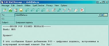Один из самых распространенных в России почтовых клиентов, программа The Bat!, обладает встроенными возможностями добавлять цифровые подписи к письмам (обратите внимание на пункт меню Privacy при редактировании письма). Подробнее об этой методике читайте в статье «Электронная цифровая подпись» (см. «Мир ПК», № 3/02).