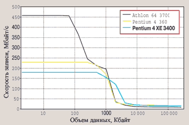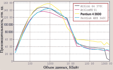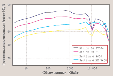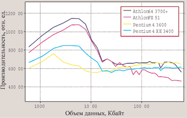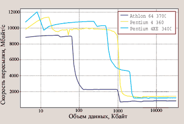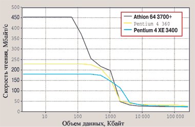 На графике зависимости скорости последовательного доступа от объема данных отчетливо просматриваются особенности процессорной кэш-памяти — огромный кэш первого уровня (L1), обладающий невысокой скоростью именно из-за своего размера. Известно, что чем больше объем кэш-памяти, тем выше ее латентность. Низкая скорость обмена с кэш-памятью второго уровня (L2) имеет исторические причины. В первых процессорах AMD с кэш-памятью второго уровня на кристалле ее объем лишь вдвое превосходил суммарный объем L1, потому была применена технология, при которой процессор мог обращаться к L2 напрямую, минуя L1. Это привело к тому, что суммарный объем кэш-памяти получался объединением объемов кэш-памяти обоих уровней. У процессоров Intel L2 передавала данные кэш-памяти первого уровня, а процессор общался только с L1. При этом объем L1 целиком поглощался объемом L2, и суммарный объем в точности равнялся объему кэш-памяти второго уровня. Но такая архитектура позволила Intel еще в Pentium III Coppermine существенно расширить ширину шины между двумя уровнями кэш-памяти, что привело к заметному росту скорости последовательного обмена с L2. Для процессоров AMD такая архитектура была неэффективна до тех пор, пока объем L2 лишь немного превосходил объем L1. Теперь же, когда объем L2 достиг 1 Мбайт, потеря 64—128 Кбайт из объема L2 для дублирования L1 уже не считается существенной.