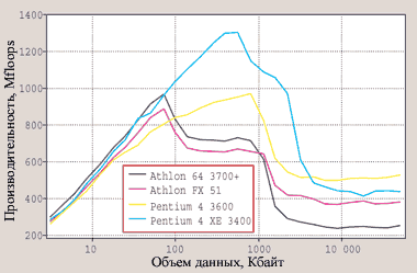 Некоторая сложность трактовки результатов обусловлена различной конфигурацией. Дело в том, что во всех сравниваемых системах было установлено 1024-Мбайт ОЗУ, причем система на базе Pentium 4 была оснащена памятью типа DDR2-533, тогда как системы на основе Athlon имели память типа DDR400. Кроме того, различались и видеоплаты. И если в системах на базе Athlon 64 и Pentium 4 они были примерно одного уровня — GeForce 5600 Ultra и GeForce 5750 соответственно, то вместе с Athlon FX была применена мощная GeForce 6800 Ultra.