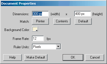 Итак, начнем. Запускаем Macromedia Flash MX 2004 и видим, что программа открывается новым файлом с расширением FLA. Чтобы задать ему нужные параметры (рис. 1), используется окно диалога Properties (Свойства), расположенное в нижней части экрана (если в указанном месте вы его не находите, то в меню Window (Окно) нажимаете на Propertie (Свойства), или же щелкаете правой клавишей мыши и в ниспадающем контекстном меню выбираете опцию Document Properties (Свойства документа).