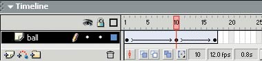 — «Создать ключевой кадр». В итоге Timeline (Монтажная линейка) должна иметь следующий вид. - Теперь мяч готов к движению. Займемся им. Выделяем мяч с помощью Arrow Tool (Инструмент выделения) и, удерживая нажатой левую кнопку мыши, переносим его на новое место — вверх нашей сцены, туда, куда он и должен допрыгнуть. Если вы сделали все правильно, то у вас получится следующий рисунок.