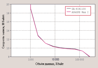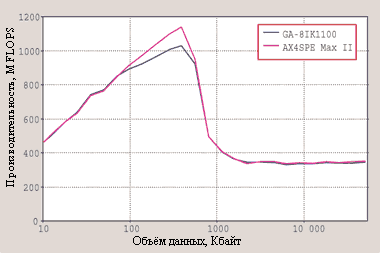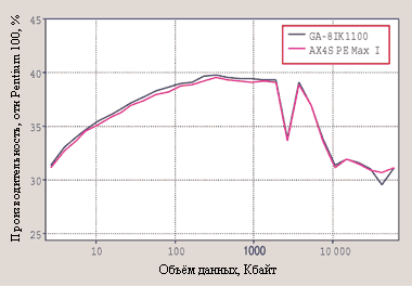 Скорость последовательного доступа у этих плат практически одинакова. А вот при произвольном доступе плата AOPEN показала чуть более высокий результат при работе с основным объемом памяти.