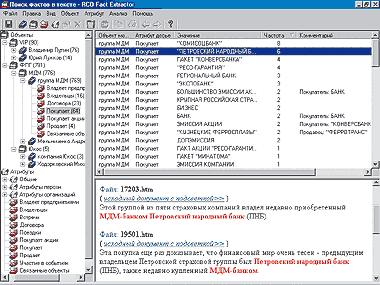 В окне слева — объекты и атрибуты, для удобства объединенные в логические группы. С каждым объектом можно связать свои атрибуты, перетащив их мышью. В окне справа — список найденных фактов, связанных с атрибутом «покупает» выбранной группы объектов МДМ. Атрибут настроен так, что факты сгруппированы по значению фигуранта «предмет покупки». В окне снизу приведены найденные описания факта покупки «Петровского народного банка» — шесть цитат из документов с возможностью просмотра их полного текста. Упорядочив записи досье по столбцу «значение», можно найти все факты других типов, связывающие группу МДМ и «Петровский народный банк», например заключение договоров. Упорядочив записи по столбцу «частота», можно отобрать факты, оказавшиеся в фокусе внимания журналистов.