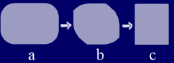 - Создайте пять ключевых кадров, как показано на рис. 3 (слой «форма»). На 1-м и 2-м кадрах расположите прямоугольник с закругленными концами, а на всех остальных — обычный (рис. 5, с). Проследите с помощью панели Info (Информация), чтобы оба объекта имели одинаковые координаты.