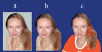 В итоге у вас должно получиться изображение, сходное с представленным на рис. 6, b. Но, к сожалению, на рисунке преобладает бежевый цвет, который "выпадает" из яркой гаммs нашей открытки. Вот тут-то мы и вспомним о призвании «фотомонтажника». Создайте новый символ типа Graphic (Графика) на основе фотографии ?fotomontazh?. Когда будете делать новые слои, то добавьте красную ленточку и яркую футболку (рис. 6, с). Как вы понимаете, здесь ничто не ограничивает вашу фантазию и чувство юмора. Добавьте также к этому символу свою подпись.