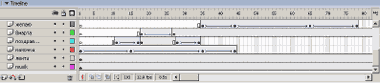 Протестировав клип, вы увидите, что лента раскрывается 3 раза. Она готовит плацдарм для обращения «Мамочка» и пожеланий: «Море цветов» и «Мир на ладони», располагающихся на одноименных слоях (рис. 2 и 3). Внимательно посмотрите на рис. 2 и 3, а еще лучше откройте файл-исходник 8mart.fla. Все три текстовых блока перемещаются по одному и тому же принципу, подчиняясь пестрой ленте. Изначально они были сжаты (ширина равна 1 пикселу), затем растянулись, какое-то время оставались неподвижными, что давало возможность прочитать надпись, и потом снова сжались. Создайте аналогичные слои и организуйте движение на них так, как показано на рис. 2 (слой «мамочка») и рис. 3 (слои «море цветов», «мир на ладони»).