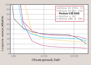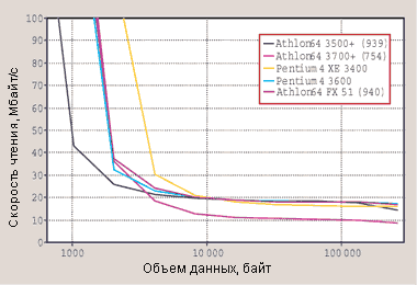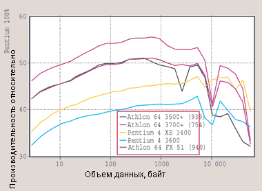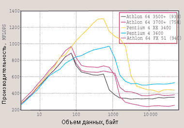На графиках показан только тот диапазон размеров, который соответствует работе с основным объемом оперативной памяти. Теоретически процессоры AMD должны обладать тем же преимуществом перед Intel и при работе с кэш-памятью, но экспериментально это установить затруднительно, так как вряд ли удастся придумать и реализовать алгоритм получения псевдослучайных чисел (адресов), который работал бы быстрее, чем кэш-память. Кстати, если бы мы не обрезали верхнюю часть графика, то увидели бы существенное превосходство AMD над Intel. Но связано оно не с эффективностью обмена с кэш-памятью, а с эффективностью выполнения коротких циклов: длинный конвейер Intel здесь здорово «тормозит». В среднем можно сказать, что если алгоритм требует большой вычислительной мощности, то Athlon 3500+ уступает своему более высокочастотному собрату 3700+ и превосходит процессоры Intel, а если алгоритм требует интенсивного обмена с памятью, то наоборот. При этом паритет с Athlon FX сохраняется. Но все это с одной оговоркой: у Athlon 3500+ всего 512 Кбайт кэш-памяти второго уровня, тогда как у других, как правило, 1024 Кбайт (исключение составляет Pentium XE, но у него есть еще кэш-память третьего уровня).