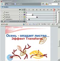 После того как все будет настроено, нажмите кнопку диалогового окна ОK. Найдите в библиотеке символ падающего листа и помещайте его экземпляры на сцене символа «Transform» столько раз, сколько вашей душе угодно, трансформируя и изменяя цвет на свой вкус (рис. 6).